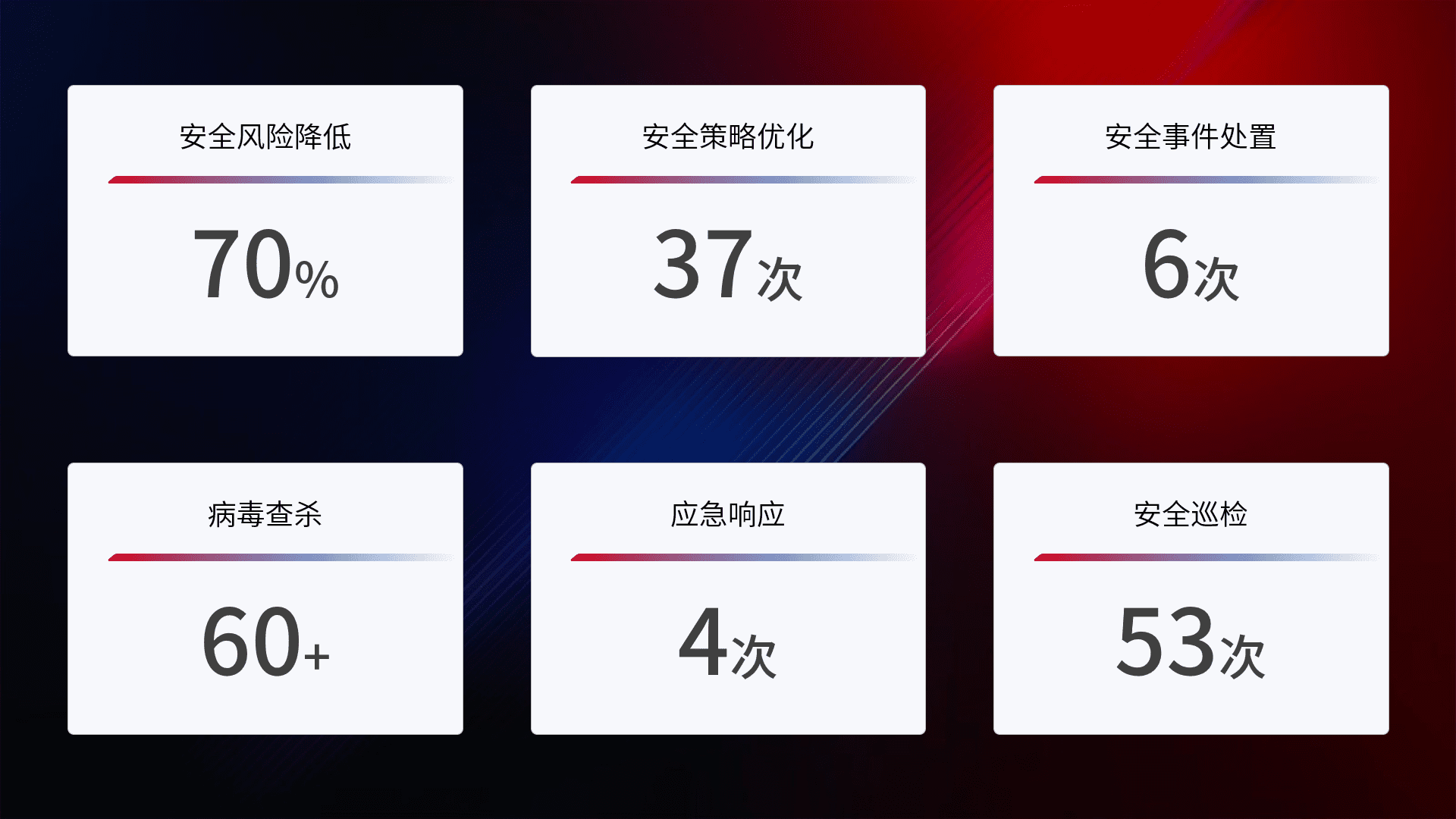 提供全面的安全事件报告体系,,,,包括处置报告、、、周报、、、、季度和年度总结,,,,结合持续监控,,帮助客户深入了解网络安全状况。。