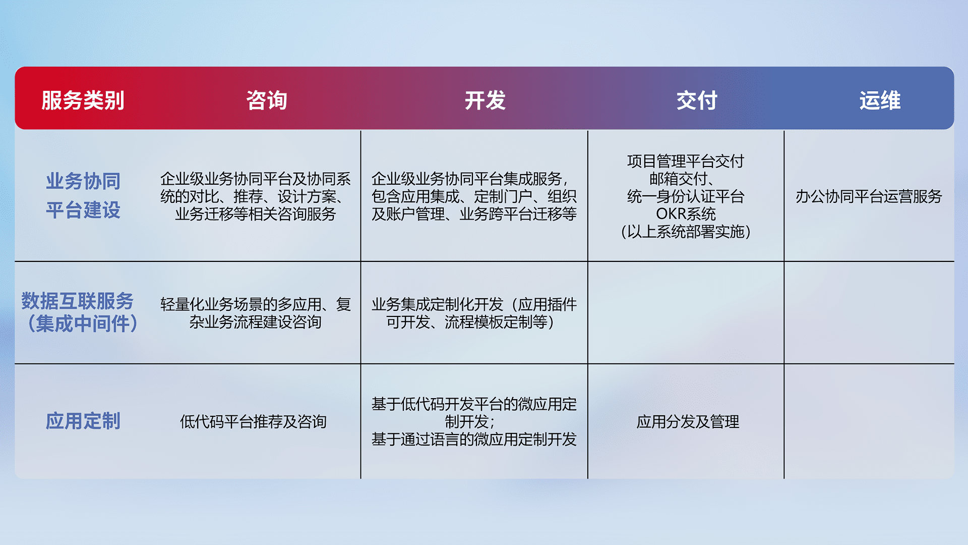 针对钉钉、、、、企微、、IDaas等平台级产品提供产品的规划、、、方案、、、交付、、定制化开发等服务,,,实现如统一协同办公、、、智能客户服务、、混合会议管理、、、、智能数据查询、、、、等业务场景,,,,实现数字化转型。。。。